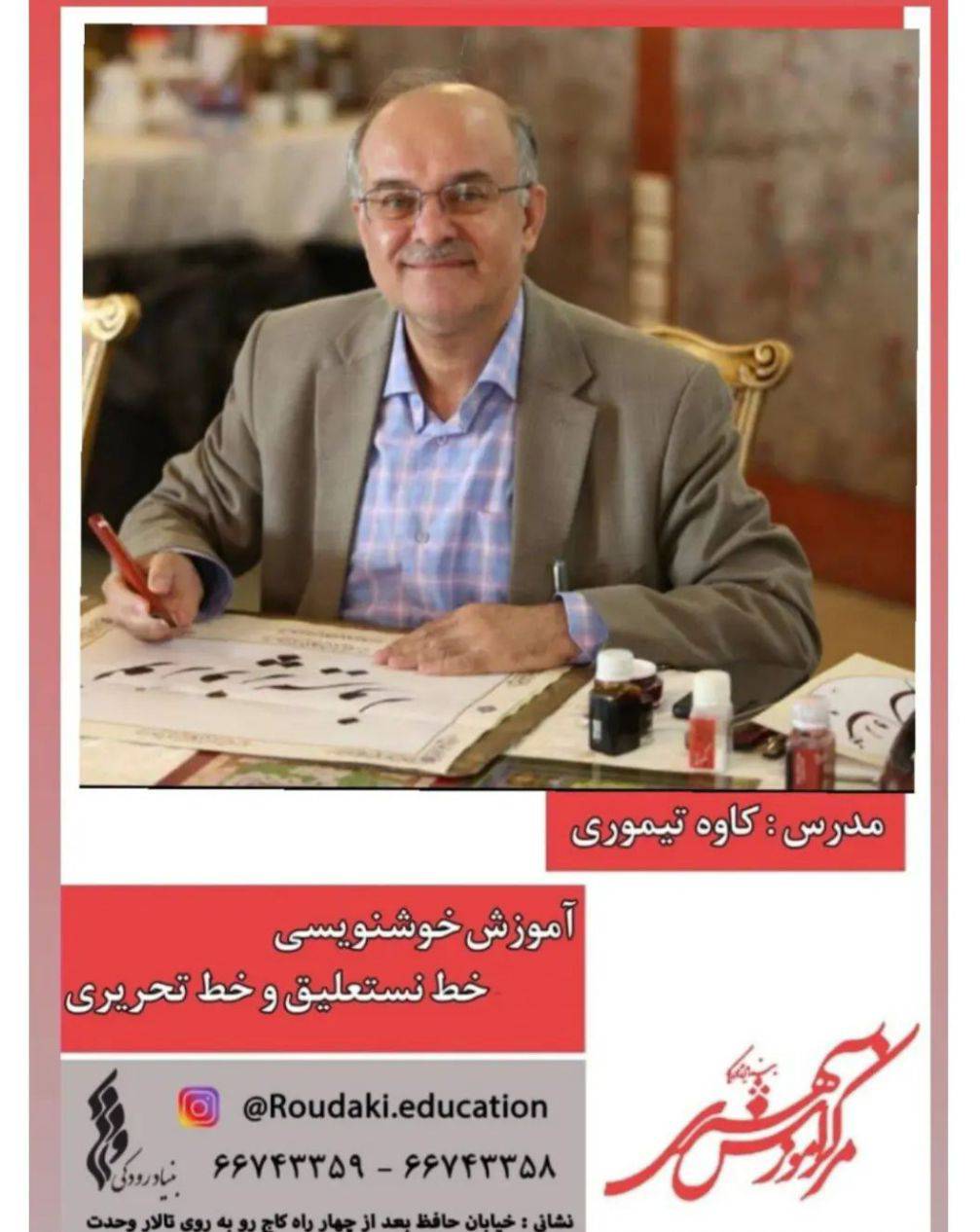دوره آموزش خوشنویسی شامل خط نستعلیق و خط تحریری با تدریس کاوه تیموری در مرکز آموزش هنری بنیاد رودکی برگزار میشود.