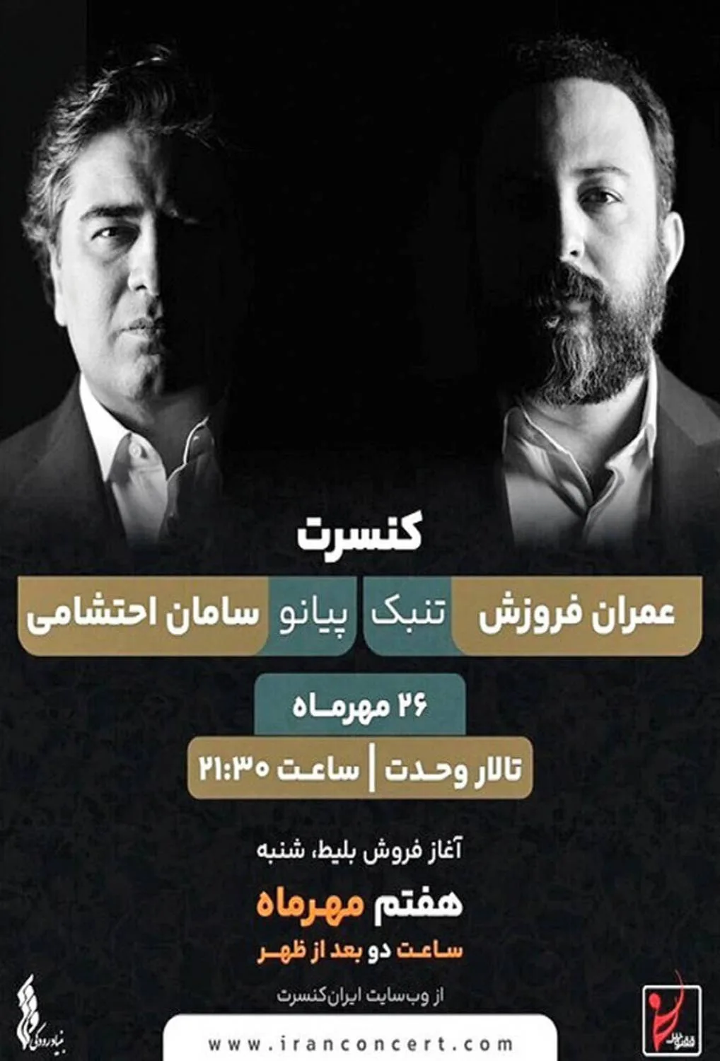 به گزارش روابط عمومی بنیاد رودکی، کنسرت سامان احتشامی و عمران فروزش با عنوان «شرقی» از ساعت ۲۱:۳۰ شامگاه پنجشنبه ۲۶ مهر در تالار وحدت برگزار میشود.