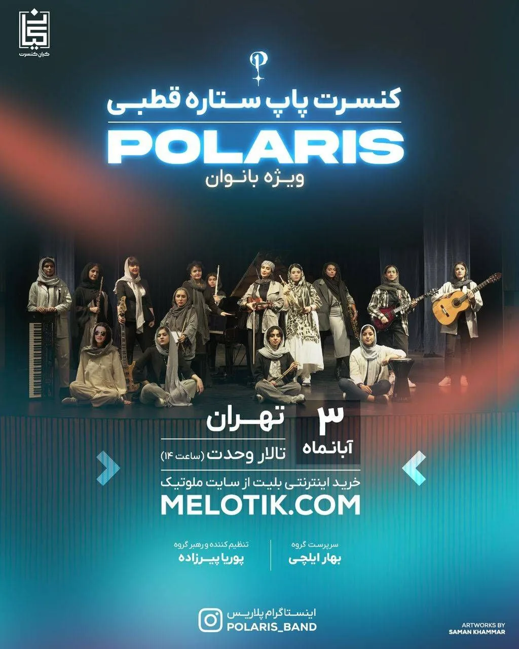 کنسرت گروه ستاره قطبی از ساعت ۱۴ روز پنجشنبه سوم آبان ماه در تالار وحدت برگزار میشود و علاقهمندان میتوانند بلیت آن را از سایت ملوتیک تهیه کنند.
