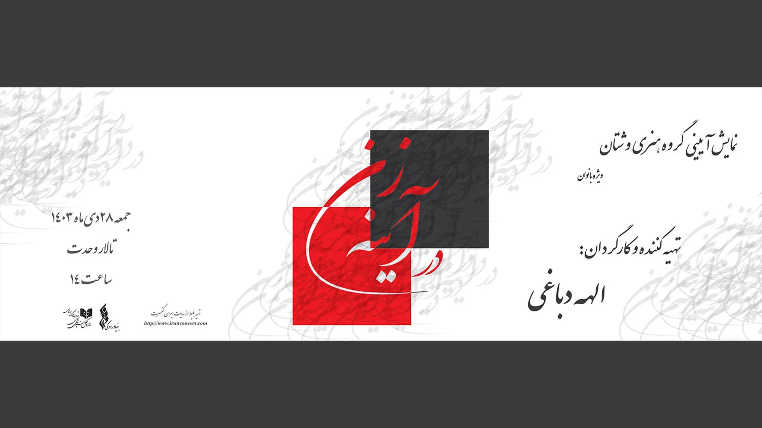 نمایش آیینی گروه هنری وشتان با عنوان «در آینه زن» از ساعت ۱۴:۰۰ روز جمعه ۲۸ دی ماه در تالار وحدت برگزار میشود و علاقهمندان میتوانند بلیت آن را از سایت ایران کنسرت تهیه کنند.