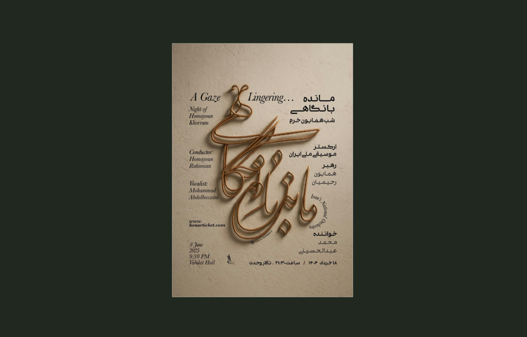 کنسرت ارکستر موسیقی ملی ایران در گرامیداشت استاد همایون خرم با عنوان «مانده با نگاهی…» به رهبری همایون رحیمیان، هجدهم خرداد از ساعت ۲۱:۳۰ در تالار وحدت برگزار میشود و علاقهمندان میتوانند بلیت آن را از سایت هنرتیکت تهیه کنند.