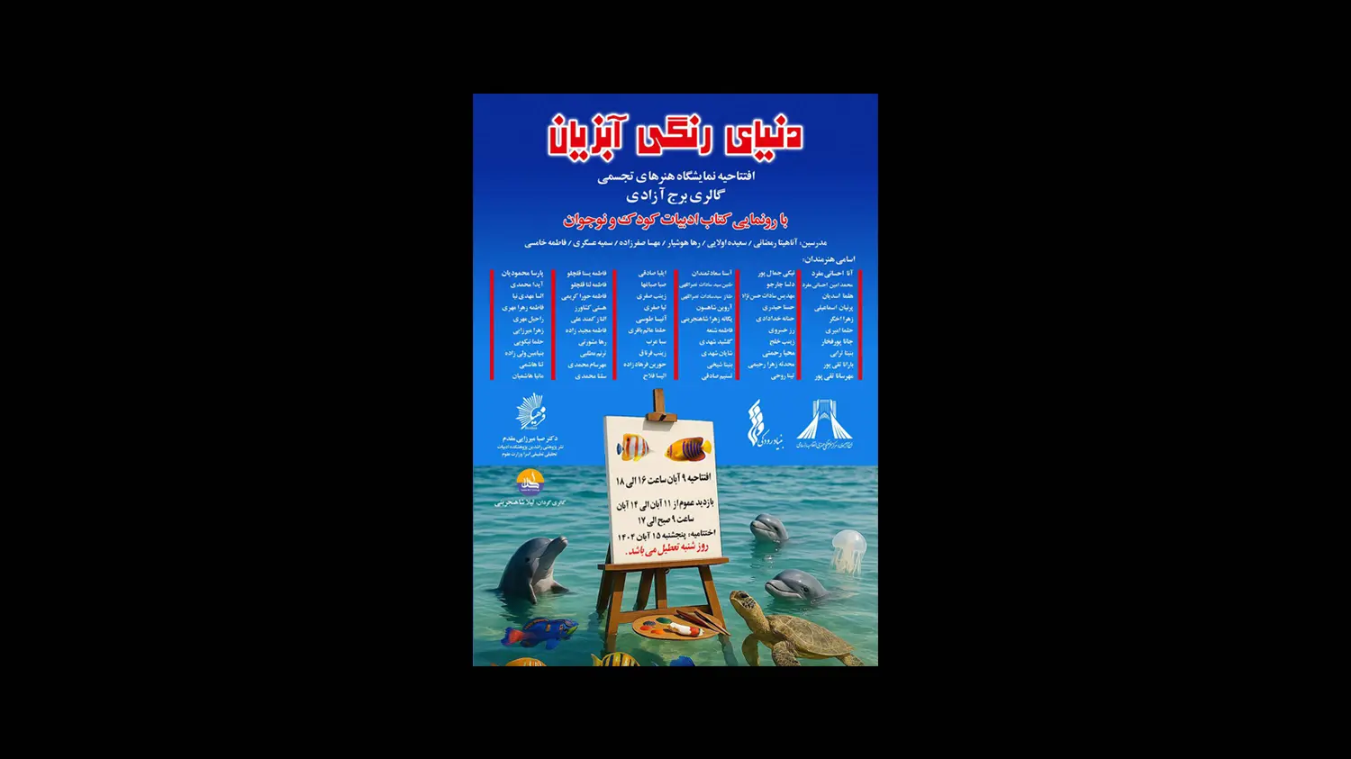 نمایشگاه هنرهای تجسمی «دنیای رنگی آبزیان» به مناسبت هفته کودک و نوجوان از ۹ تا ۱۴ آبان در کافهگالری برج آزادی برگزار میشود.