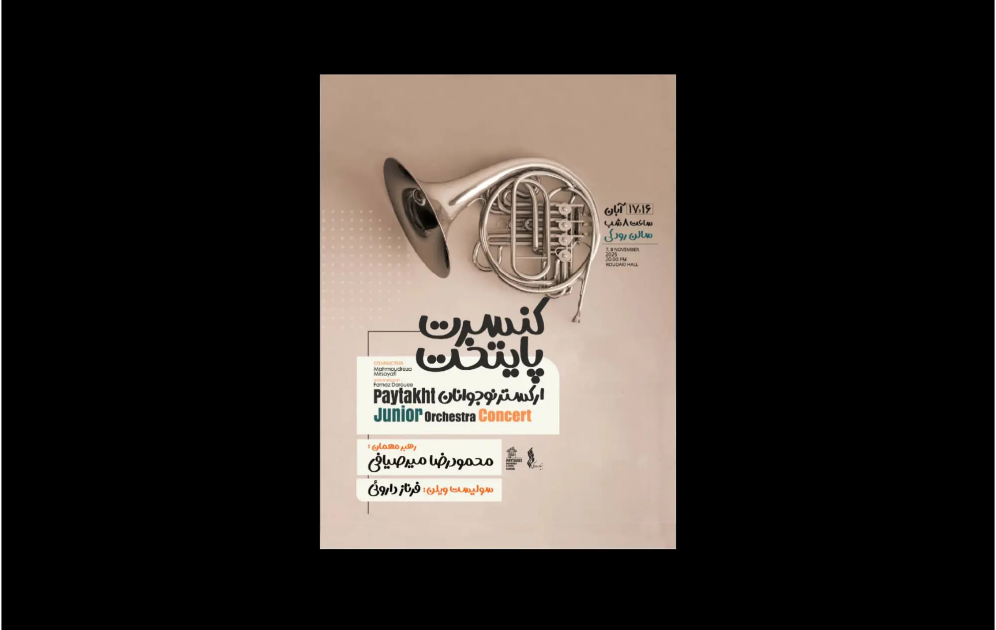 کنسرت ارکستر نوجوانان پایتخت با رهبری میهمان محمودرضا میرصیافی، ۱۶ و ۱۷ آبان در تالار رودکی برگزار میشود.