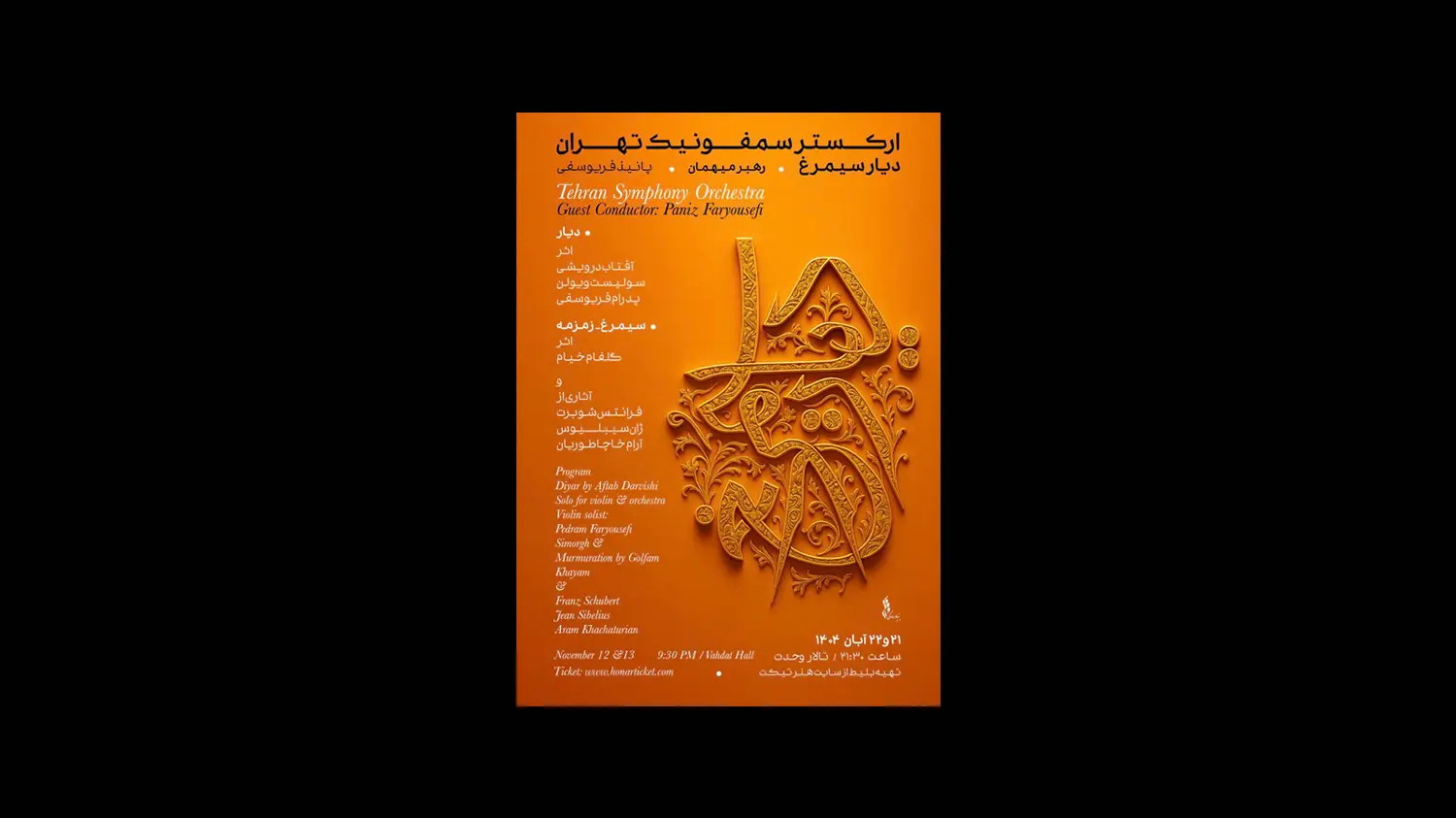 کنسرت ارکستر سمفونیک تهران با عنوان “دیارِ سیمرغ” با رهبری میهمان پانیذ فریوسفی ۲۱ و ۲۲ آبان، ساعت ۲۱:۳۰ در تالار وحدت برگزار میشود و علاقمندان میتوانند جهت تهیه بلیت این برنامه به سایت هنرتیکت مراجعه نمایند.