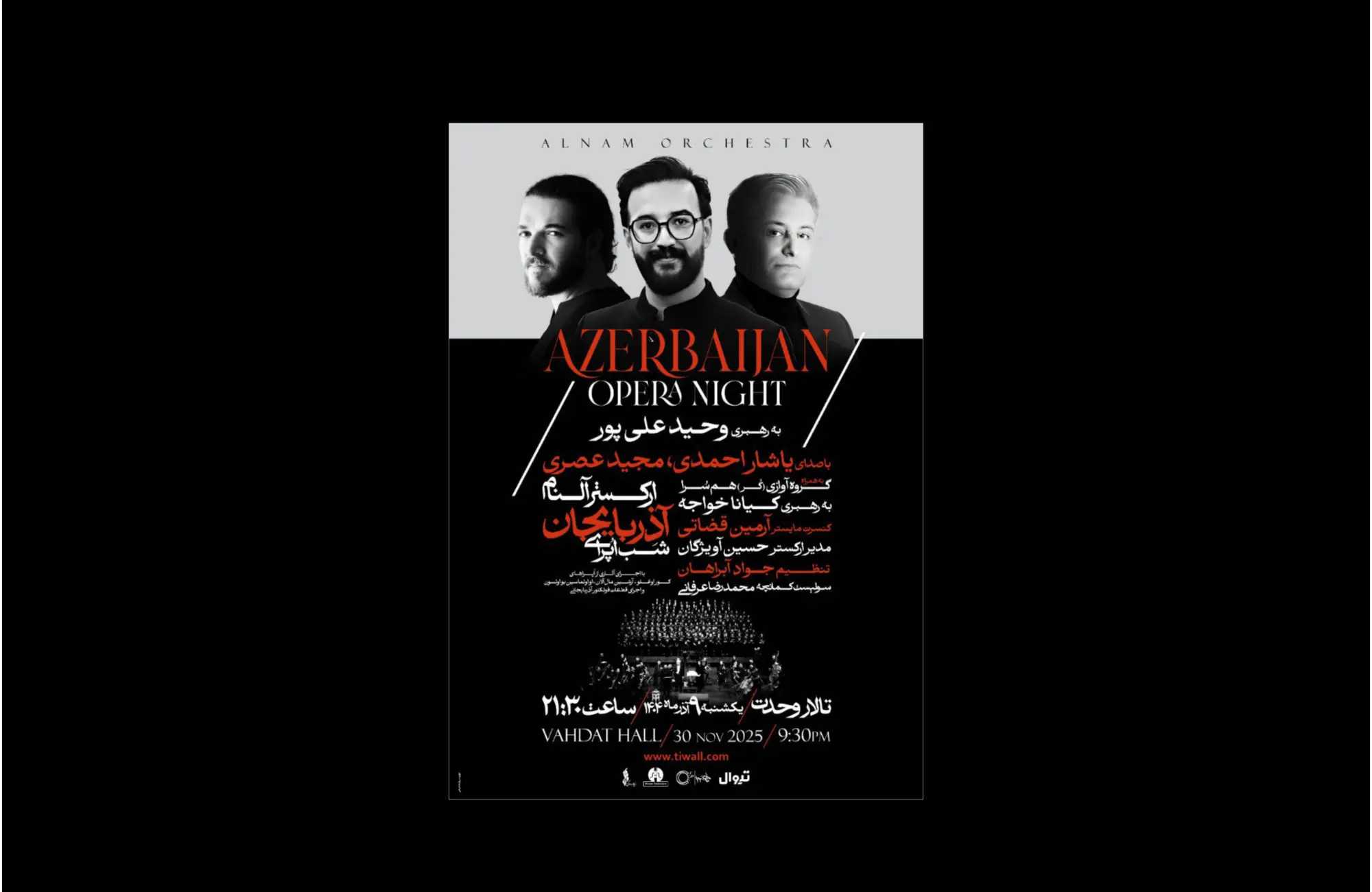 کنسرت «شب اپرای آذربایجان» با اجرای ارکستر آلنام به رهبری وحید علیپور از ساعت ۲۱:۳۰ شامگاه یکشنبه ۹ آذر در تالار وحدت برگزار میشود.