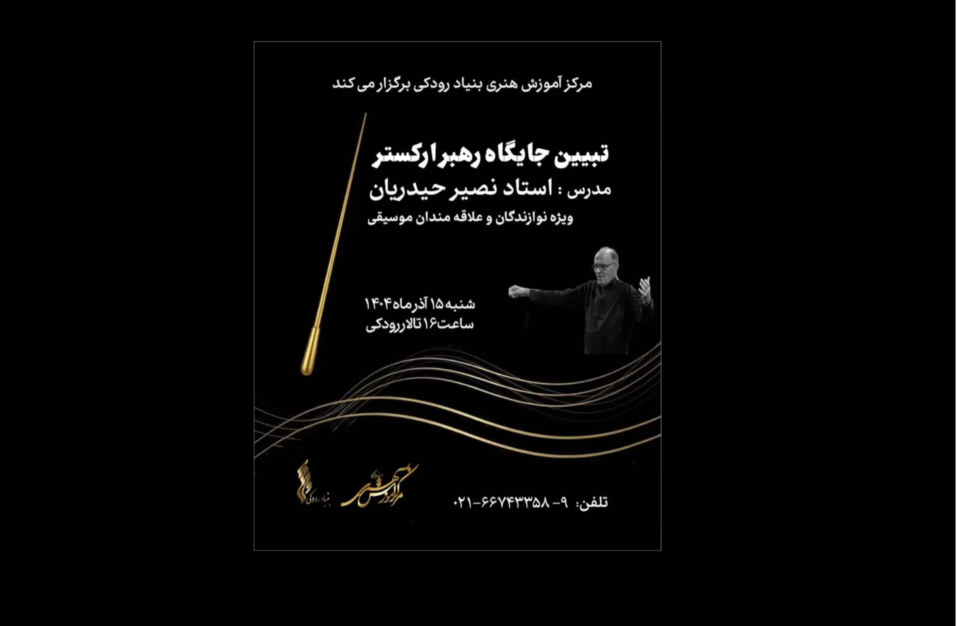 مرکز آموزش هنری بنیاد رودکی، بهمنظور ارتقای توان تخصصی هنرجویان و فعالان عرصه موسیقی، کارگاه آموزشی «تبیین جایگاه رهبر ارکستر» را با تدریس نصیر حیدریان برگزار میکند.