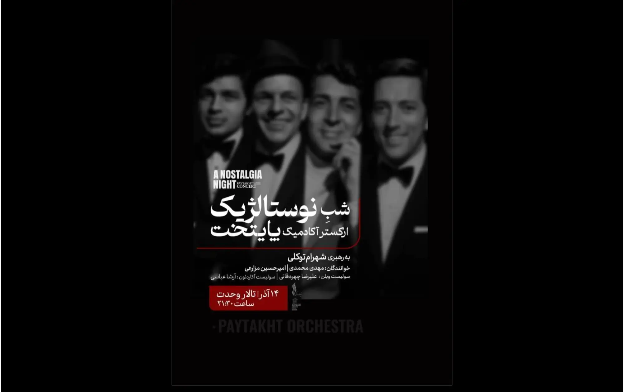 ارکستر و گروه کر پایتخت، با رهبری شهرام توکلی و خوانندگی مهدی محمدی و امیرحسین مزارعی شامگاه ۱۴ آذرماه کنسرت «یک شبِ نوستالژیک» را در تالار وحدت روی صحنه میبرند.