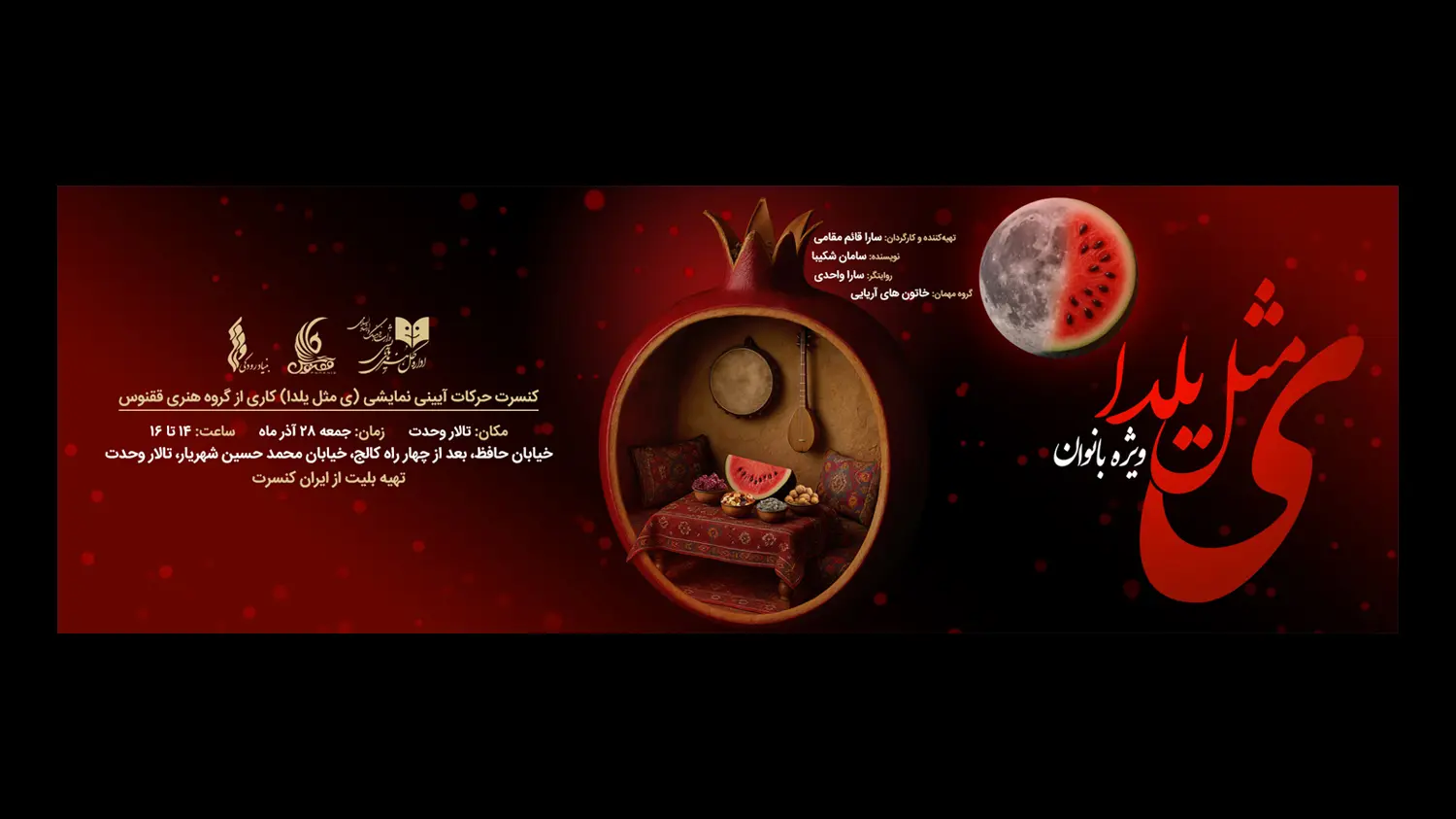 نمایش «ی مثل یلدا» جمعه ۲۸ آذر ماه از ساعت ۱۴، ویژه بانوان در تالار وحدت روی صحنه میرود و علاقهمندان میتوانند جهت تهیه بلیت به سایت ایران کنسرت مراجعه کنند.