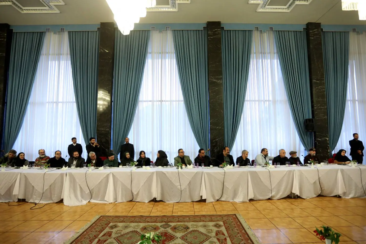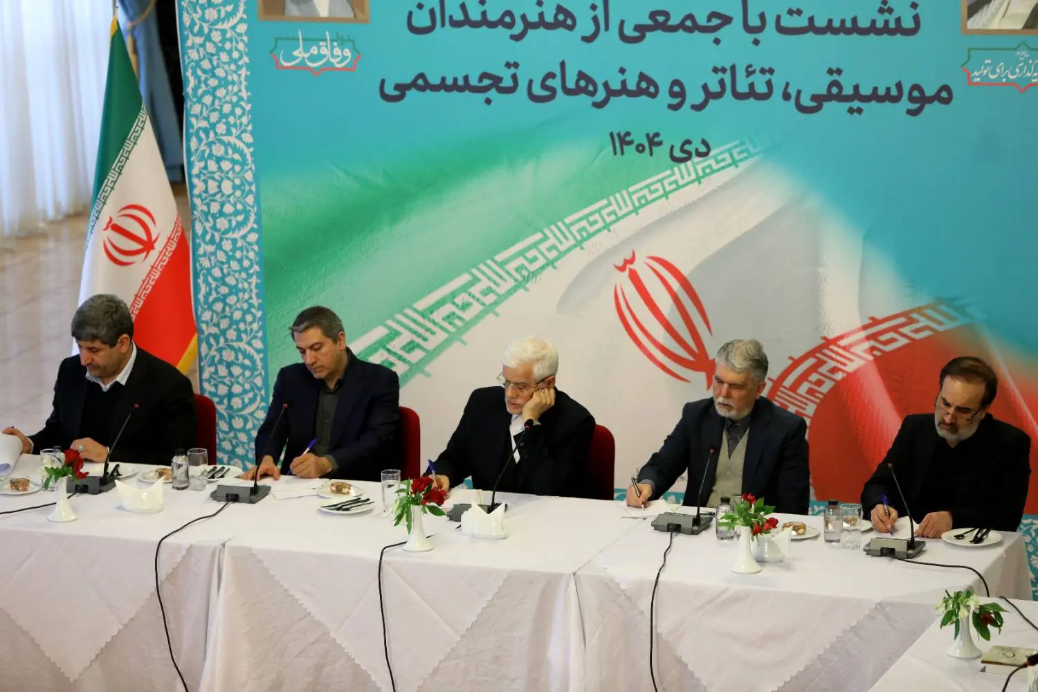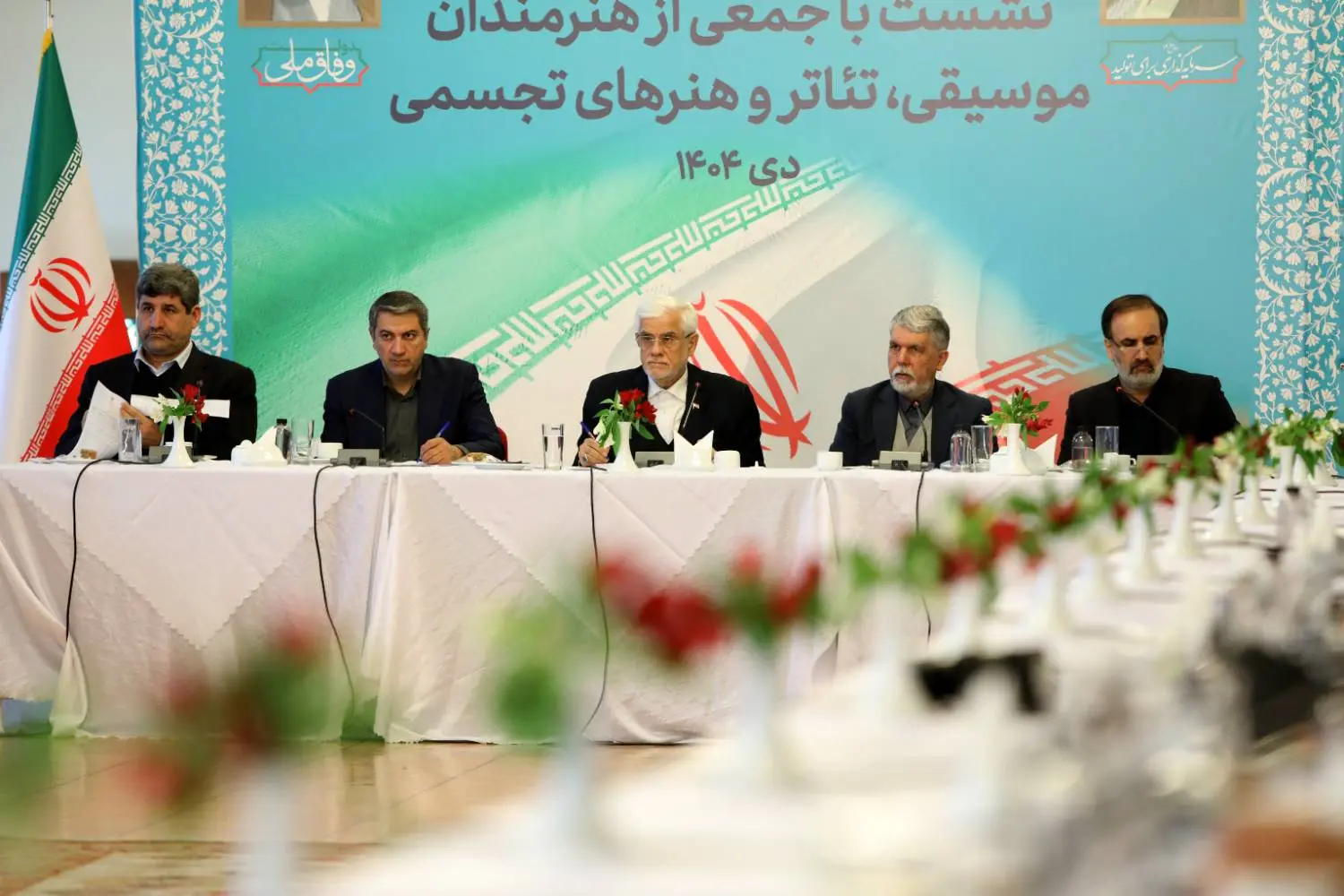 محمدرضا عارف معاون اول رئیسجمهور با همراهی سیدعباس صالحی وزیر فرهنگ و ارشاد اسلامی با جمعی از هنرمندان موسیقی، تئاتر و هنرهای تجسمی دیدار و گفتگو کرد